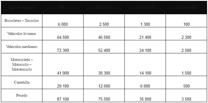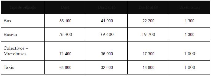 Teniendo en cuenta el mismo criterio del incremento en el salario mínimo legal, las tarifas de patios y grúas para el 2017 quedan de la siguiente forma para vehículos de servicio público: