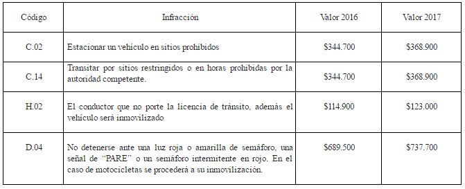 Nuevas tarifas de comparendos para el 2017