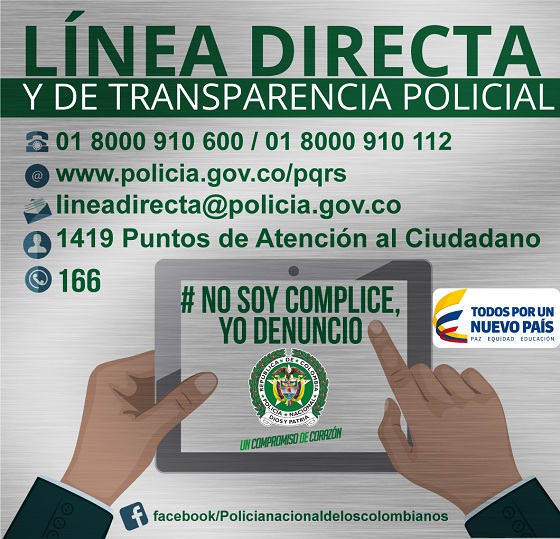 Para la Policía Nacional, los ciudadanos denunciantes se convierten en sus principales aliados en la construcción de una Institución más transparente y confiable. De igual manera, representan con su apoyo a través de la denuncia, un juicio sólido y directo para la estructuración de un país en paz.