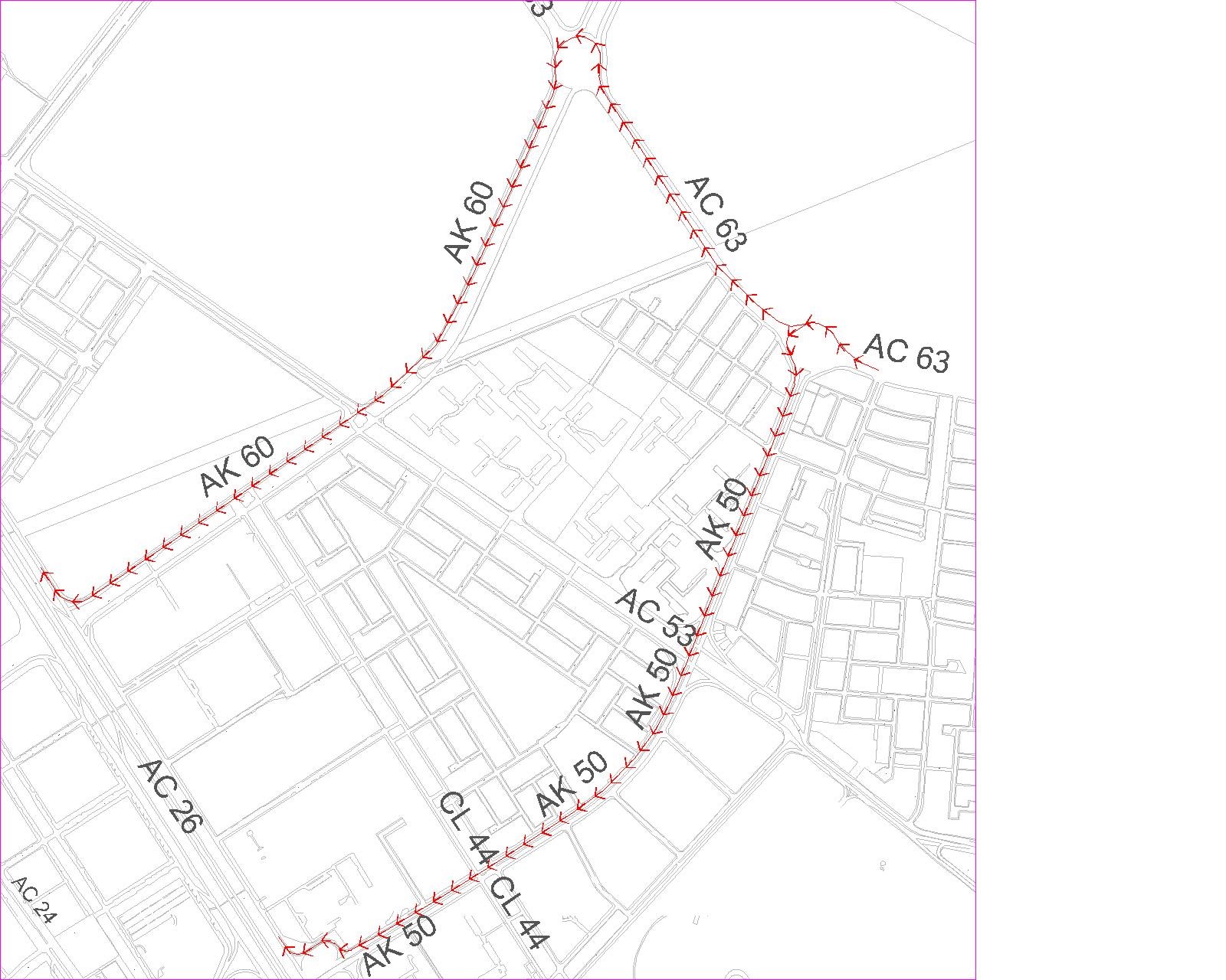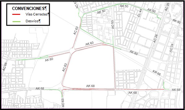 - Las rutas de transporte público y particular que circulan en sentido Oriente-Occidente por la Av. Calle 63, deberán tomar la Av. Carrera 50 al Sur – Av. Calle 26 al Occidente. Este desvío se implementará hasta que se habilite la Av. Carrera 60.