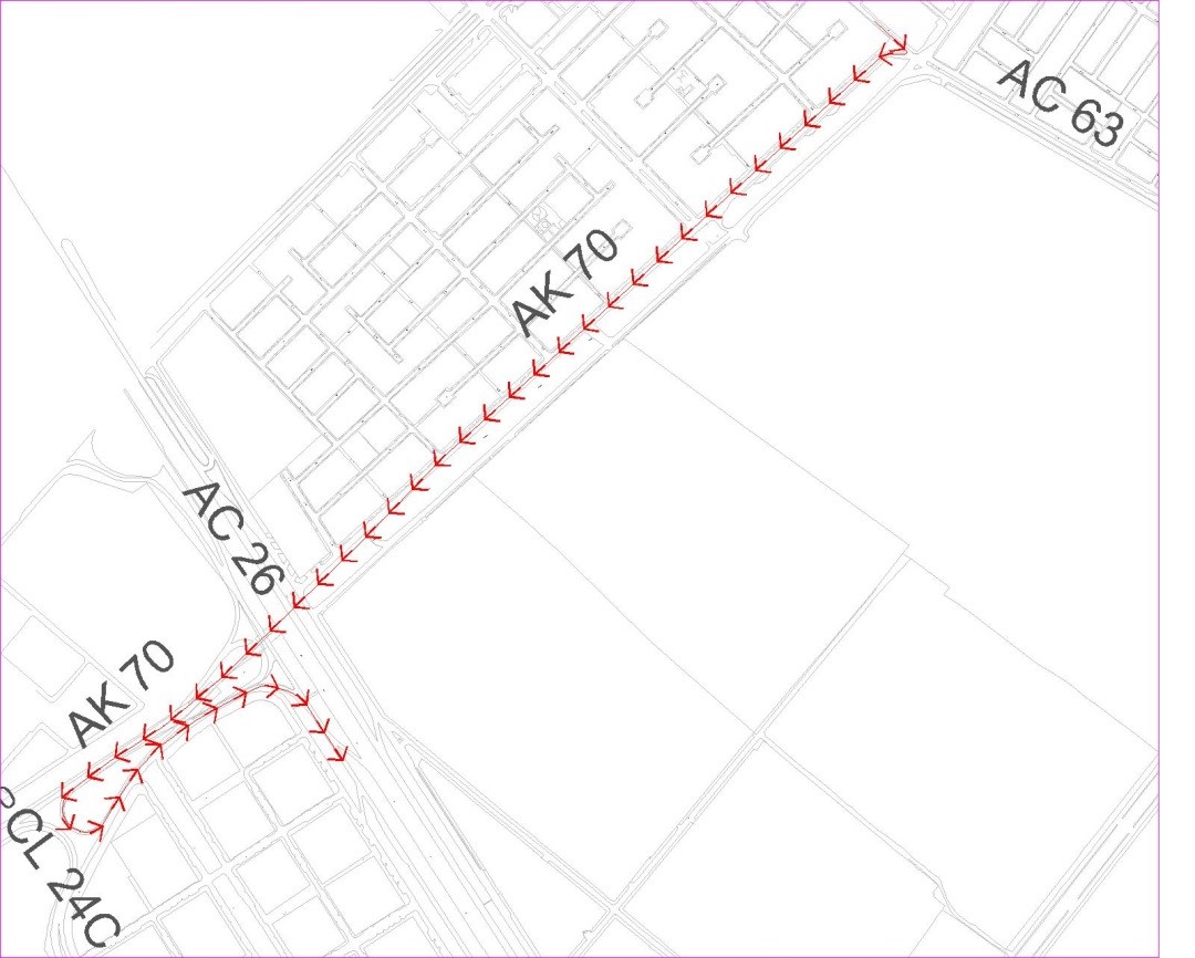 - Las rutas de transporte público y particular que transitan por la Av. Calle 63 en sentido Occidente – Oriente, deberán tomar la Av. Constitución al Sur – Calle 24C realizando una “U” al Norte hasta la Av. Calle 26 al Oriente y buscará su recorrido habitual.