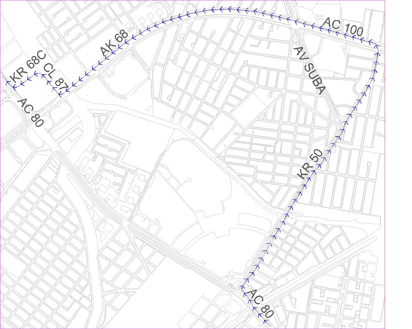- Las rutas de transporte público y particular que circulan en sentido Oriente – Occidente por la Av. Calle 80, deberán tomar la Av. Suba al Norte – Carrera 50 y Carrera 49 al Norte – Av. Calle 100 al Occidente – Av. Carrera 68 al Sur – Av. Calle 80 al Occidente.